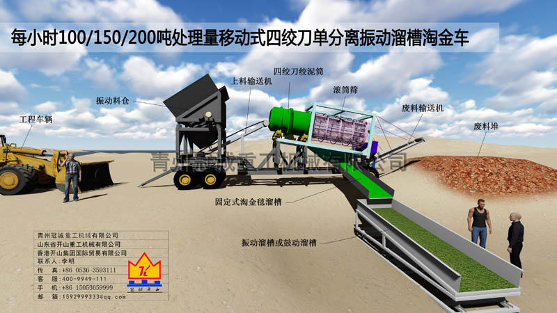 移動(dòng)式四絞刀滾筒篩單分離振動(dòng)溜槽沙金車簡介: